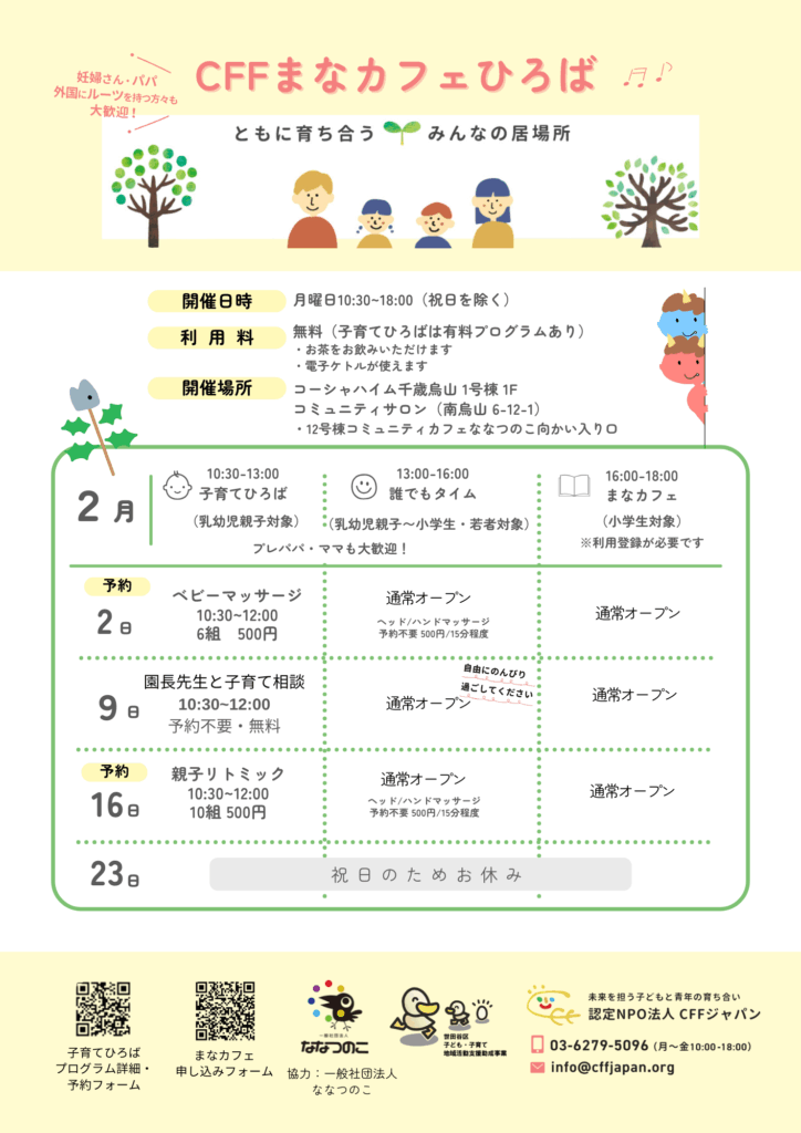 CFFは、“子どもと青年の育ち合い”を柱に、これまで海外3ヶ国で活動をしてきました。2020年に世田谷区の烏山地区に引っ越してきたのを機に、地域のみなさん・親子と共に育ち合う場でありたいと、週1回、コーシャハイム千歳烏山 1号棟 1Fコミュニティサロン(南烏山 6-12-1)にて子育てひろばやプログラムなどを開催しています。